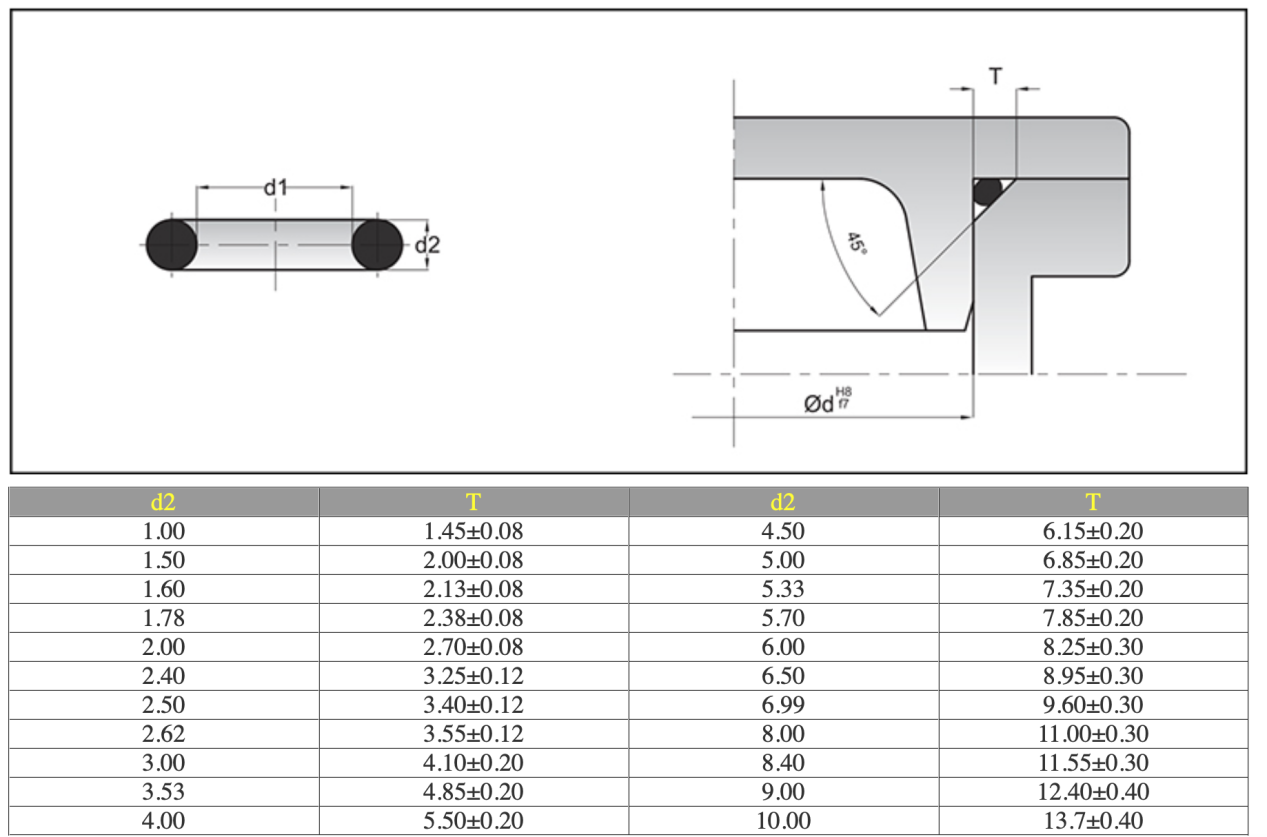 對于執(zhí)行GB34521-94標準的0形圈,因為其溝槽標準GB3452.3-87中并未涉及三角形溝槽,可參考下表設(shè)計,也可按T=1.3~1.4W(W即0形圈斷面直徑)設(shè)計三角形溝槽。
