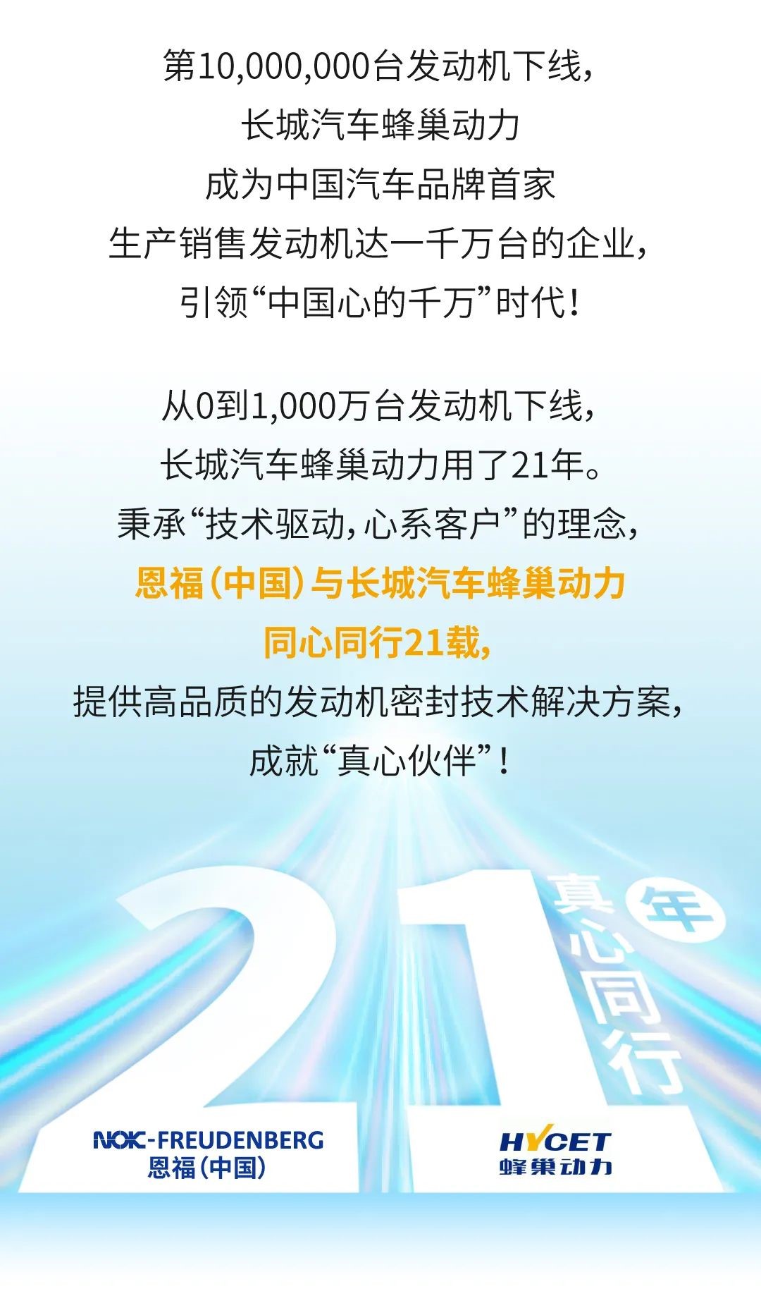 恩福將繼續(xù)作為“真心伙伴”陪伴長城汽車蜂巢動力,攜手推動中國汽車產(chǎn)業(yè)不斷發(fā)展創(chuàng)新!一起走下一個21年!